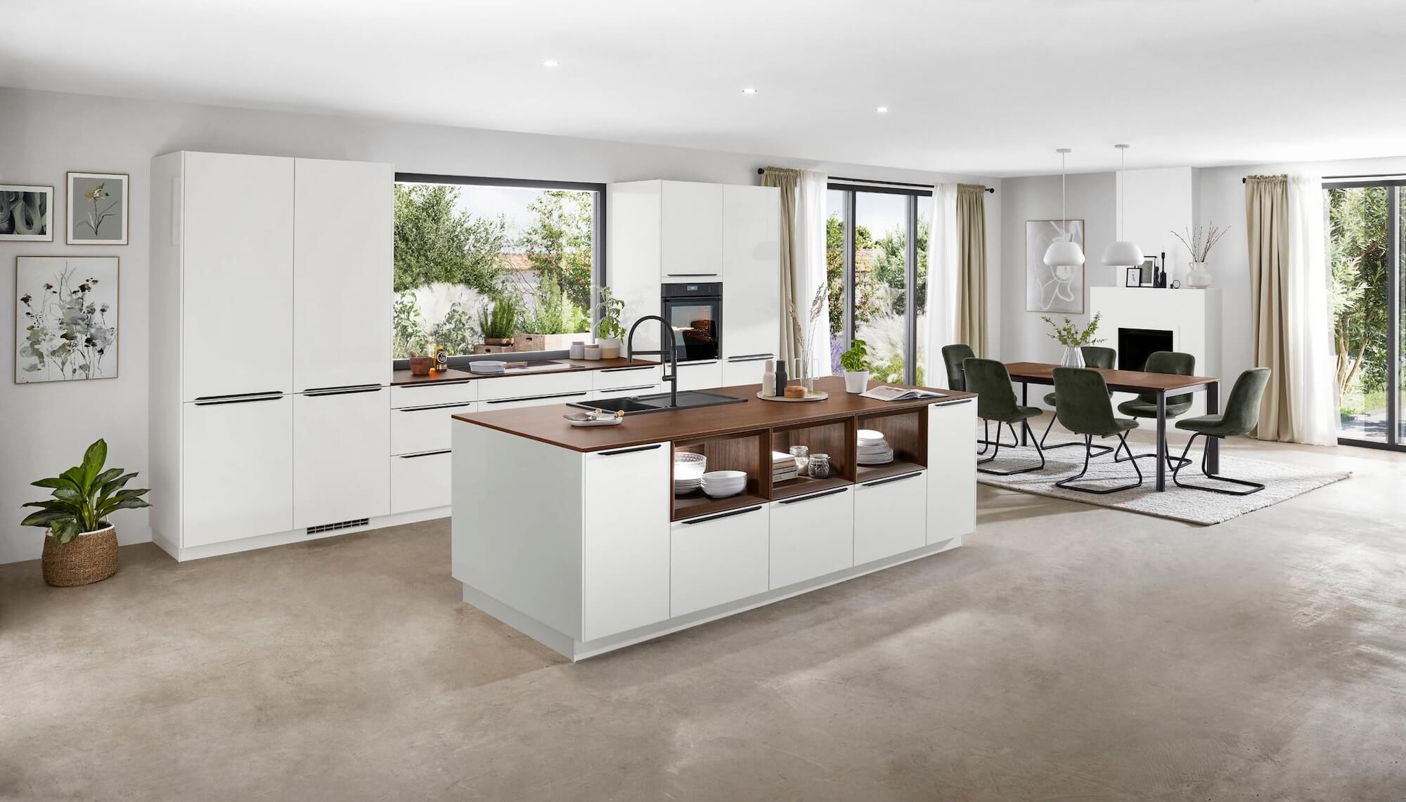 Белоснежные, идеально глянцевые кухонные фасады элегантно гармонируют с теплыми оттенками и текстурой древесины. Игра бликов на отражающих свет поверхностях мебели создает сложные оптические иллюзии. Этот интерьер создан для кулинарных экспериментов и задушевных семейных трапез.